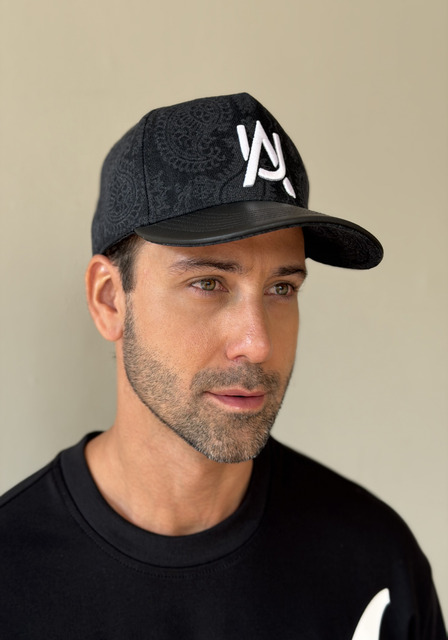 Esta gorra, de estilo contemporáneo y urbano, se caracteriza por su diseño bicolor y su visera semi plana de color negro. La parte frontal de la gorra es de un diseño de bandana en tonos monocromáticos, que contrasta con el tono claro de la visera. En el centro, un logo en relieve de las letras «A» y «U» entrelazadas está bordado en un color blanco carbón a juego, creando una apariencia monocromática y sofisticada.