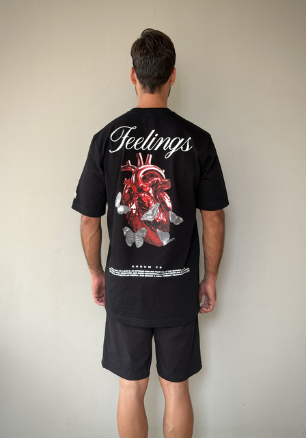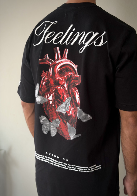 Esta camiseta negra combina moda urbana y arte conceptual en una sola prenda. En la parte trasera, presenta un impactante diseño gráfico de un corazón anatómico en rojo vibrante, rodeado de mariposas grises que evocan libertad y transformación. Sobre la ilustración, la palabra “Feelings” en una tipografía cursiva aporta un toque sofisticado y emocional. Debajo, un texto en letras pequeñas complementa el mensaje, resaltando la intensidad de las emociones y el poder de los sentimientos. Confeccionada en algodón de alta calidad, esta camiseta es perfecta para quienes buscan expresar su estilo con un aire artístico y contemporáneo.