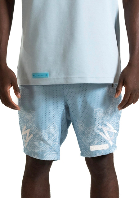 Este short de estilo unisex está confeccionado en un tejido de malla de poliéster de color azul celeste, que lo hace ligero y transpirable, ideal para actividades deportivas o para un uso casual en climas cálidos. El diseño presenta un estampado de bandana en color blanco, que se extiende por los laterales de las piernas, dándole un toque de estilo urbano. La cintura elástica con cordón ajustable en color blanco permite un ajuste personalizado y cómodo. En la parte frontal, dos bolsillos con cremalleras metálicas, con el logo de la marca, añaden un detalle funcional y moderno. En los laterales, se aprecian las iniciales «AW» en color blanco y el estampado de bandana que sube por la costura exterior, lo que lo convierte en una prenda versátil y con carácter.
