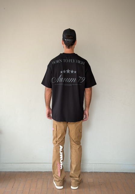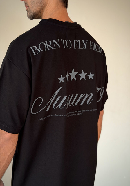 Esta camiseta negra destaca por su estilo oversized y un diseño trasero impactante que combina tipografías finas con un motivo de estrellas y la frase “Born to Fly High”. Su composición ligera y suave ofrece comodidad durante todo el día, mientras que el estampado aporta un aire aspiracional y moderno. La palabra “Aurum 79” en gran tamaño añade identidad y carácter, convirtiéndola en una prenda ideal para quienes buscan estilo, presencia y un mensaje inspirador dentro de su outfit casual.