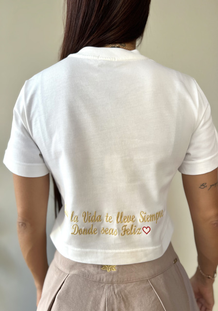La Goa T-shirt combina comodidad y actitud en una prenda versátil. Su diseño cropped resalta la figura con un toque moderno, mientras el bordado dorado y la frase motivadora en la parte posterior aportan un detalle distintivo. Ideal para outfits relajados con un aire elegante y positivo.