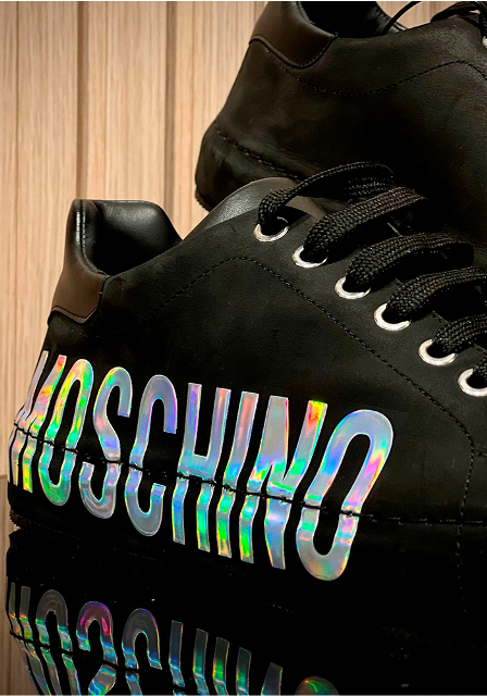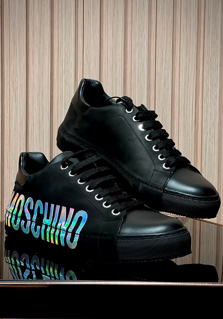 Estos tenis Moschino de corte clásico son una fusión de estilo minimalista y un toque audaz. Están confeccionados en cuero negro de alta calidad, con cordones y suela del mismo color para un look monocromático y elegante. El detalle distintivo y llamativo es el logo de la marca, «MOSCHINO», en el lateral de cada zapato, que presenta un acabado iridiscente o tornasol. Este logo cambia de color con la luz, creando un efecto visual único que le da a los tenis un carácter moderno y sofisticado. Son el calzado perfecto para quienes buscan una pieza versátil que combine la elegancia atemporal del negro con un toque de originalidad.