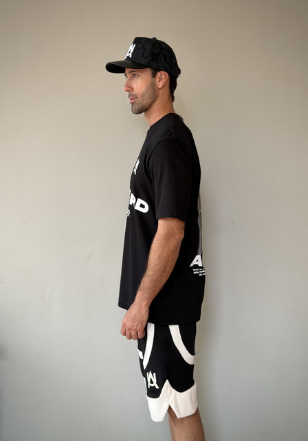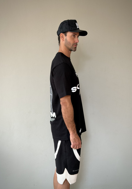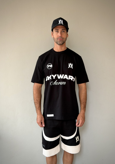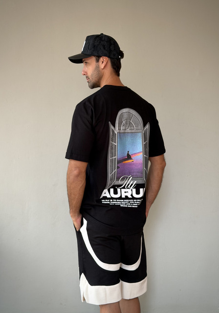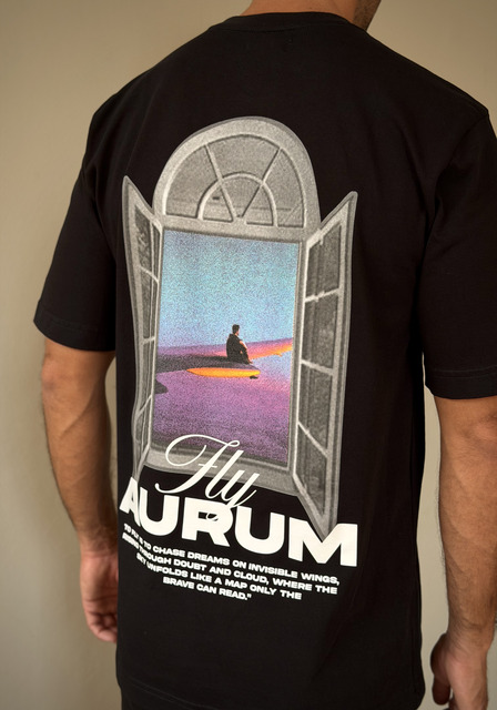 Esta camiseta negra destaca por su enfoque visual profundamente artístico y conceptual. En la parte posterior, un gran gráfico muestra una ventana abierta que enmarca un paisaje vibrante al atardecer, donde una figura contemplativa mira hacia el horizonte. Debajo, el distintivo texto “Fly Aurum” se fusiona con una frase inspiradora que evoca la idea de perseguir sueños, elevarse y trascender límites. El frente mantiene un estilo limpio y moderno con elementos gráficos de marca, logrando un equilibrio perfecto entre lo minimal y lo narrativo. Su silueta cómoda y urbana la convierte en una pieza clave para quienes buscan expresión, estilo y significado en una sola prenda.